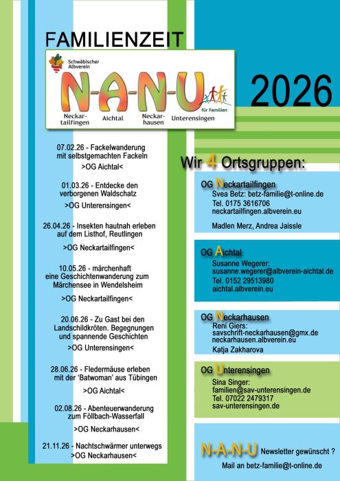 Das N A N U-Projekt ist eine gemeinsame Initiative von vier benachbarten Albvereins-Ortsgruppen in unserer Region: Neckartailfingen, Aichtal, Neckarhausen und Unterensingen. Ziel dieser Kooperation ist es, Familien durch abwechslungsreiche Naturerlebnisse, Wanderungen und kreative Aktionen für das gemeinsame Draußensein zu begeistern und das Vereinsleben generationenübergreifend zu stärken.